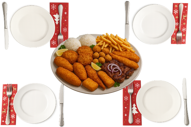 (Sertés gordon 3 db, Kárpáti borzaska 3 db, Rántott gomba 6 db, Rántott hal 3 db, Rántott sajt 3 db, Cigánypecsenyem, csomagolási díj (a feltüntetett ár már tartalmazza))